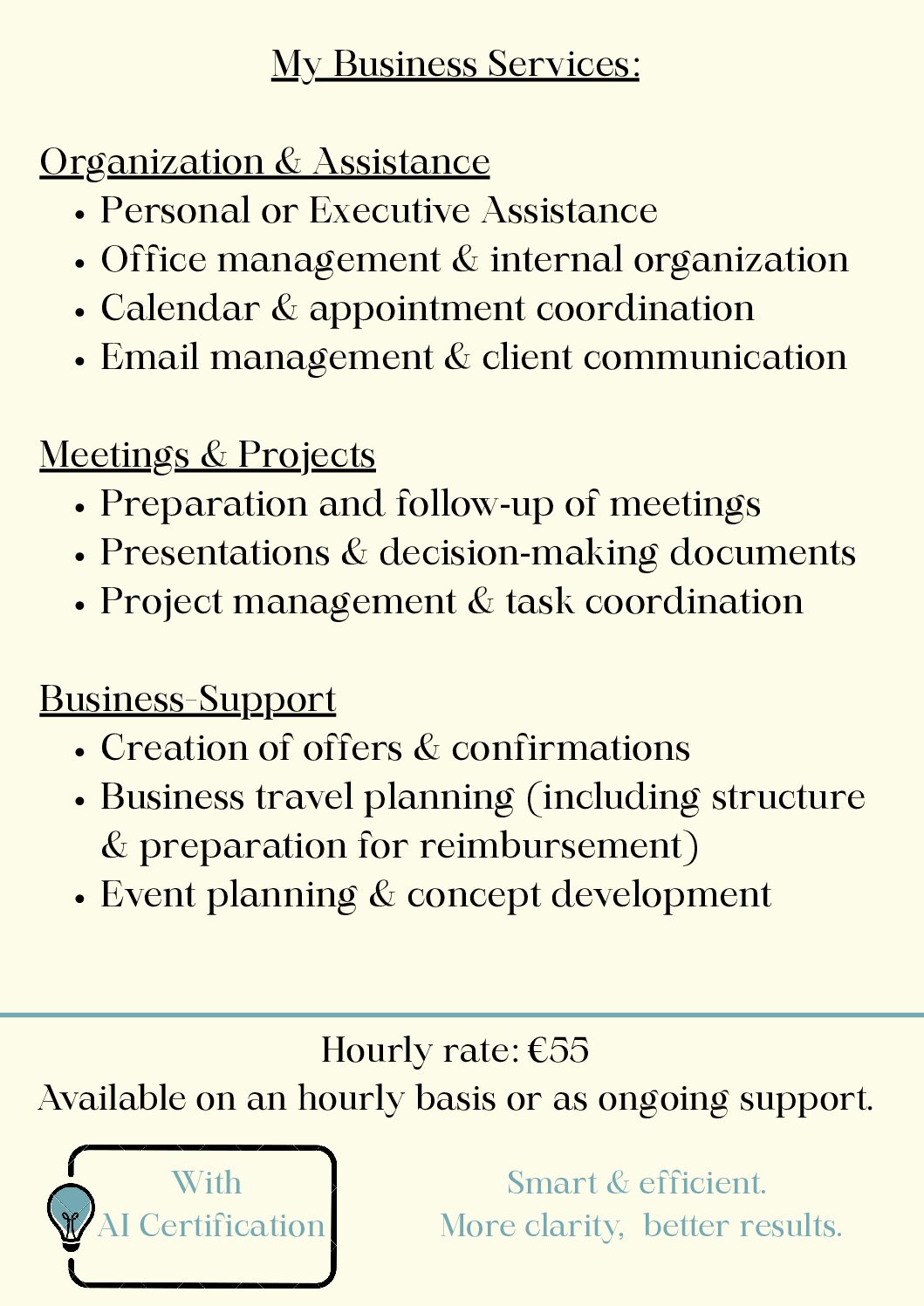 With five years of experience as a personal executive assistant to the board of a Munich-based foundation, I bring the highest level of discretion, organizational talent and C-level expertise. International communication, structured workflows, and proactive support are second nature to me.